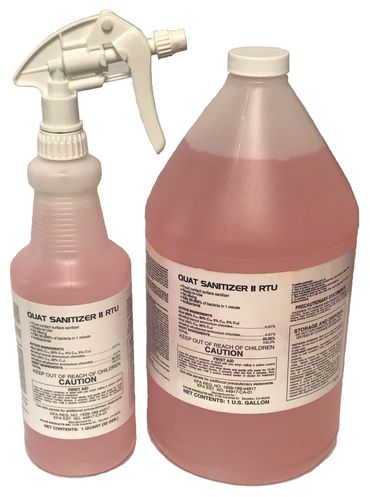 When used as directed, QUAT Surface Sanitizer RTU will sanitize previously cleaned and rinsed, non-porous, food contact surfaces: food holding tanks, eating utensils, drinking glasses, counter tops and finished wood or plastic chopping blocks.